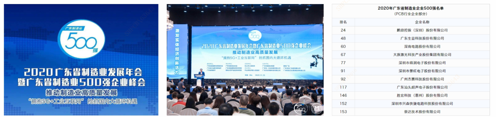 會上發布了2020年廣東制造業500強榜單,其中PCB行業企業表現亮眼,我司與鵬鼎控股、生益科技、深南電路、大族激光等29家企業上榜。得利于研發成果初顯成效,技術品質雙提升,引進國際大客戶,產品結構調整升級,擴產項目投產,產能增加,公司營業收入穩步提升,今年公司排名較2019年提升了20名,位列146名。
