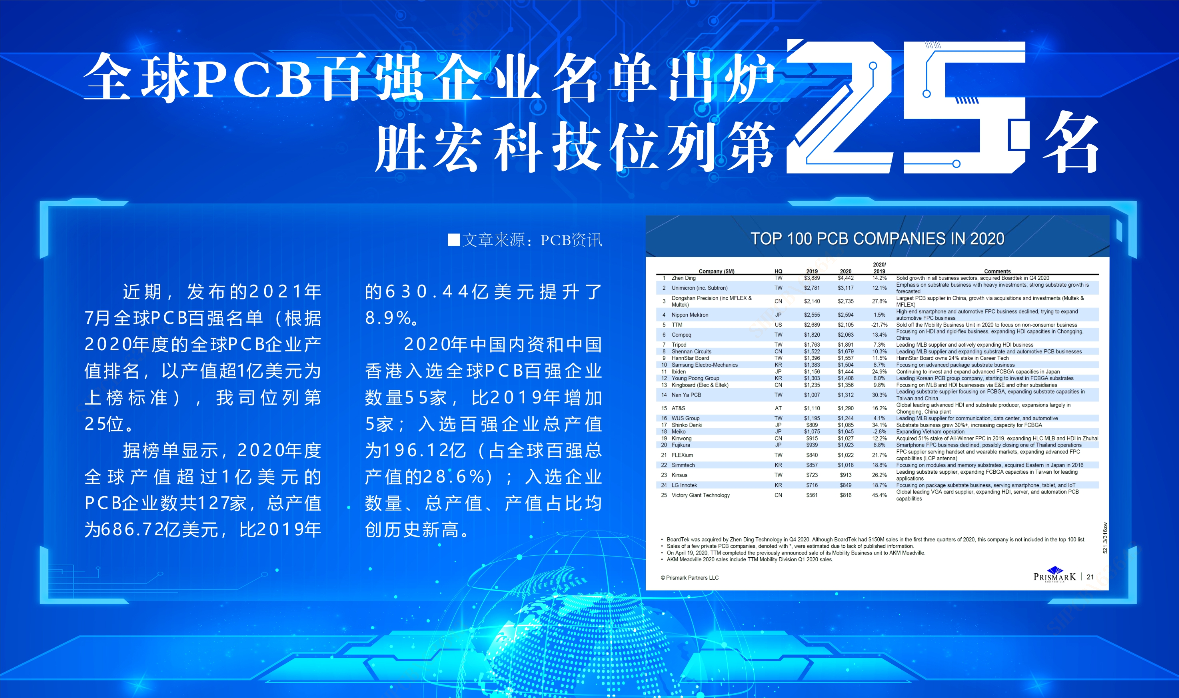 近期,Prismark發布2021年7月全球PCB百強名單(根據2020年度的全球PCB企業產值排名,以產值超1億美元為上榜標準),我司位列第25位。