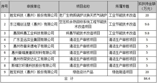 據公示附件“2021年惠陽區節能專項資金項目擬安排表”內容,獲得嘉獎的項目共有三個專題類別,分別為:工業節能技術改造、清潔生產審核項目和綠色制造項目,分別有3項目、5項目和1項目。其中金年會科技(惠州)股份有限公司的老廠生物質鍋爐汰換天然氣鍋爐,東江精創注塑(惠州)有限公司的空壓機余熱回收系統工程節能技術改造項目等3項目為工業節能技術改造;金年會科技(惠州)股份有限公司的綠色設計產品為綠色制造項目;惠州普瑞康建筑材料有限公司、廣東至遠實業集團有限公司等5企業的清潔生產審核項目為清潔生產審核項目。